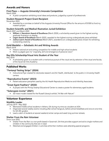 In 2022, Rachel graduated Magna Cum Laude from the University of Georgia where she received her Bachelor of Fine Arts in Scientific Illustration. Before earning her degree, Rachel participated in the Student Scientific and Medical Illustration Juried Exhibitions and was awarded both the “Joshua Laerm Award of Excellence” and the “Logan Award of Excellence”.